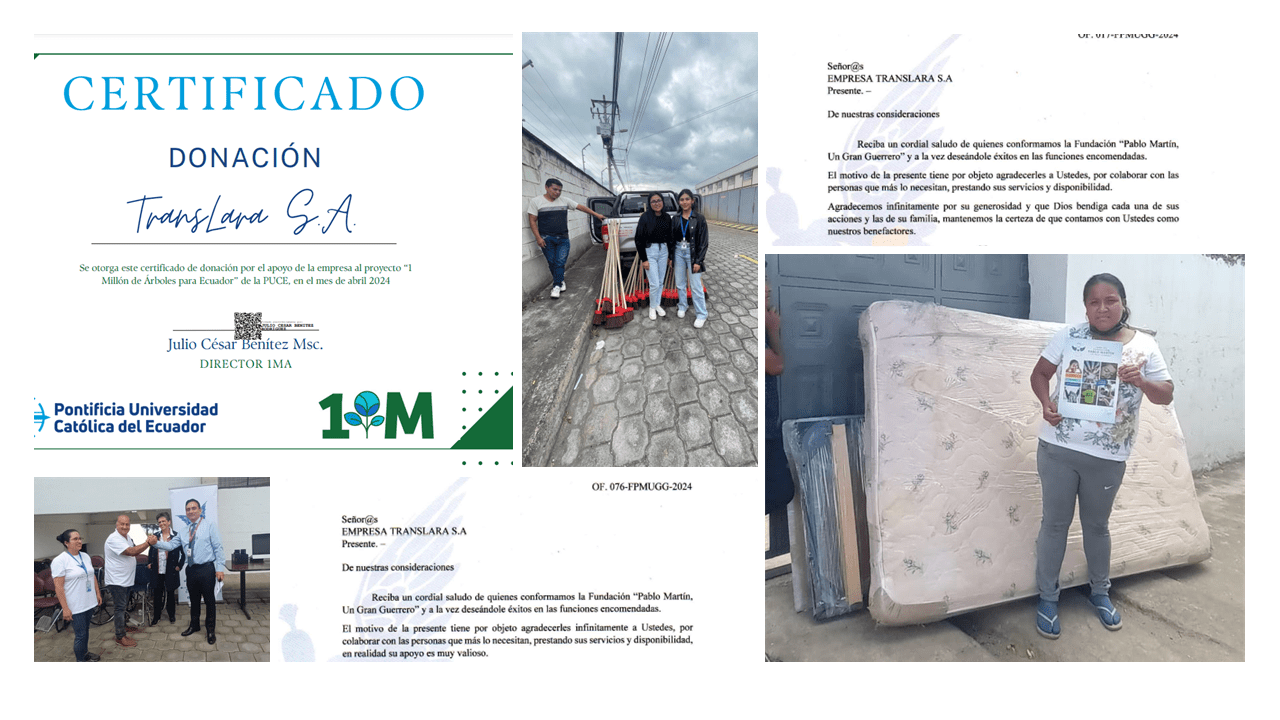 Además, apoyamos la fundación de Pablo Martín “Un Gran Guerrero”, dedicada a mejorar la calidad de vida de niños y jóvenes en situaciones vulnerables, igualmente hemos apoyado a comunidades aledañas, realizamos una donación de insumos de limpieza al Municipio de Cayambe. Nuestro apoyo a fundaciones y comunidades refleja nuestro compromiso con el desarrollo social y el bienestar de las futuras generaciones.